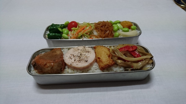 お弁当はおとといと変わらない内容ですが、鶏ハムが加わりました。私の実家の母が作ってくれたものをもらってきたのです。鶏の胸肉で作ったそうです。だーりんが「鶏好き」と知って持たせてくれました。実家の母も「鶏好き」です。しっとりと美味しいハムに仕上がっています。塩加減もグー。