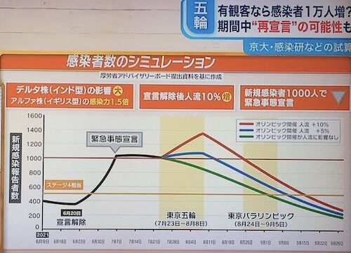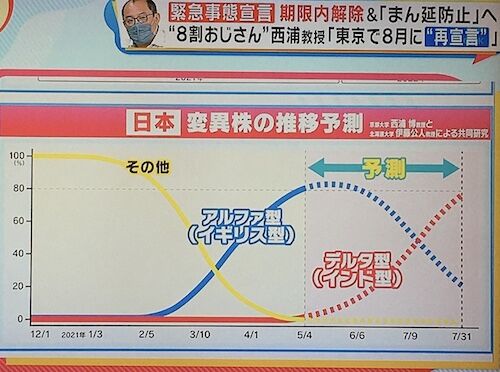 インド型について、京都大の西浦博教授(理論疫学)は、感染力が従来株の約1.8倍で、7月中旬に半数を超え、同月末には8割に達するとの試算を公表。国立感染症研究所の脇田隆字所長は予測の難しさを挙げた上で、「今はなるべく早く見つけ、クラスター対策や(濃厚接触者らを追跡する)積極的疫学調査によって置き換わりを抑える時期だ」として、監視体制の強化を呼び掛ける。