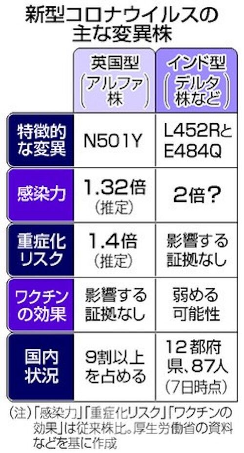 インド型をめぐっては、慶応大の小崎健次郎教授(臨床遺伝学)らのチームが、インドから直接流入しただけでなく、英国や米国を経由したケースもあるとの解析をまとめた。国際的なデータベースの公開情報などを基にしたもので、小崎教授は「変異株は最初の流行地域から直接流入するだけとは限らない。水際対策を強化すべきだ」と指摘している。