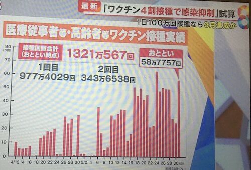 現在の接種ペースは1日約40万~50万回だが、6月17日から1日100万回接種が実現した場合、9月9日に接種完了率が4割に到達。1日80万回のペースにとどまれば、4割の接種完了は10月1日にずれ込む結果となった。