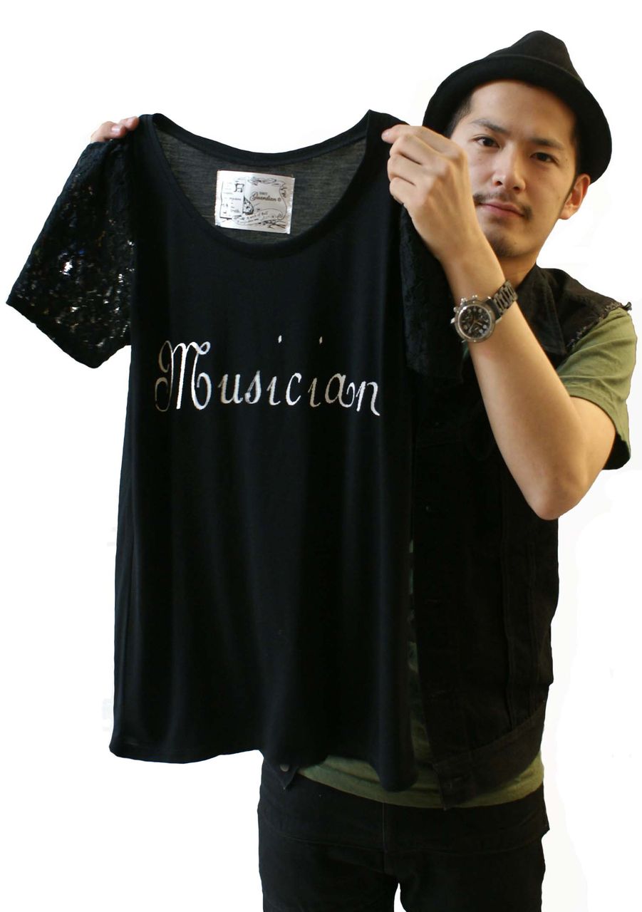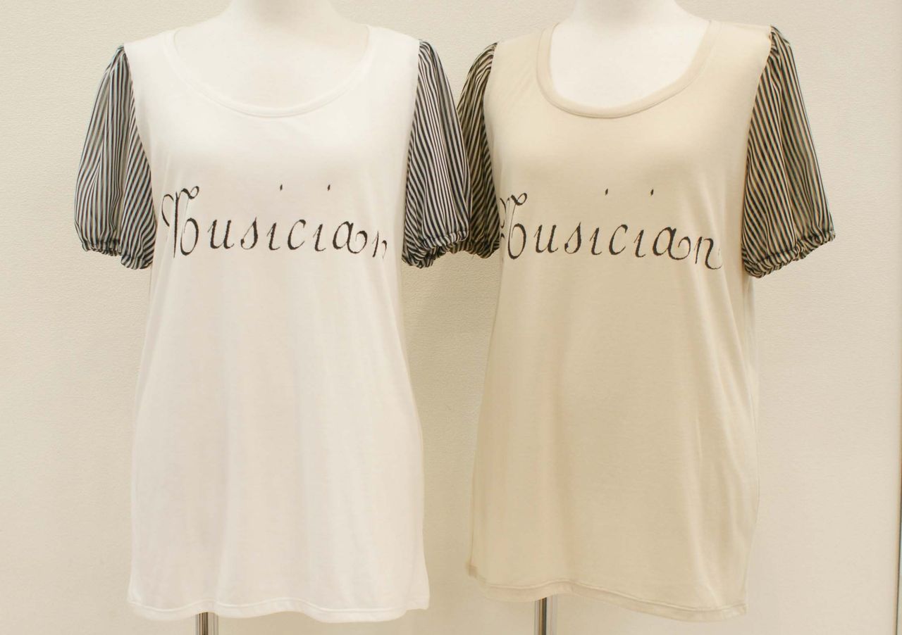 袖がシフォンのストライプ柄でお作りしたエレガントなTシャツです。ミュージシャンのロゴがキャッチーな1枚。