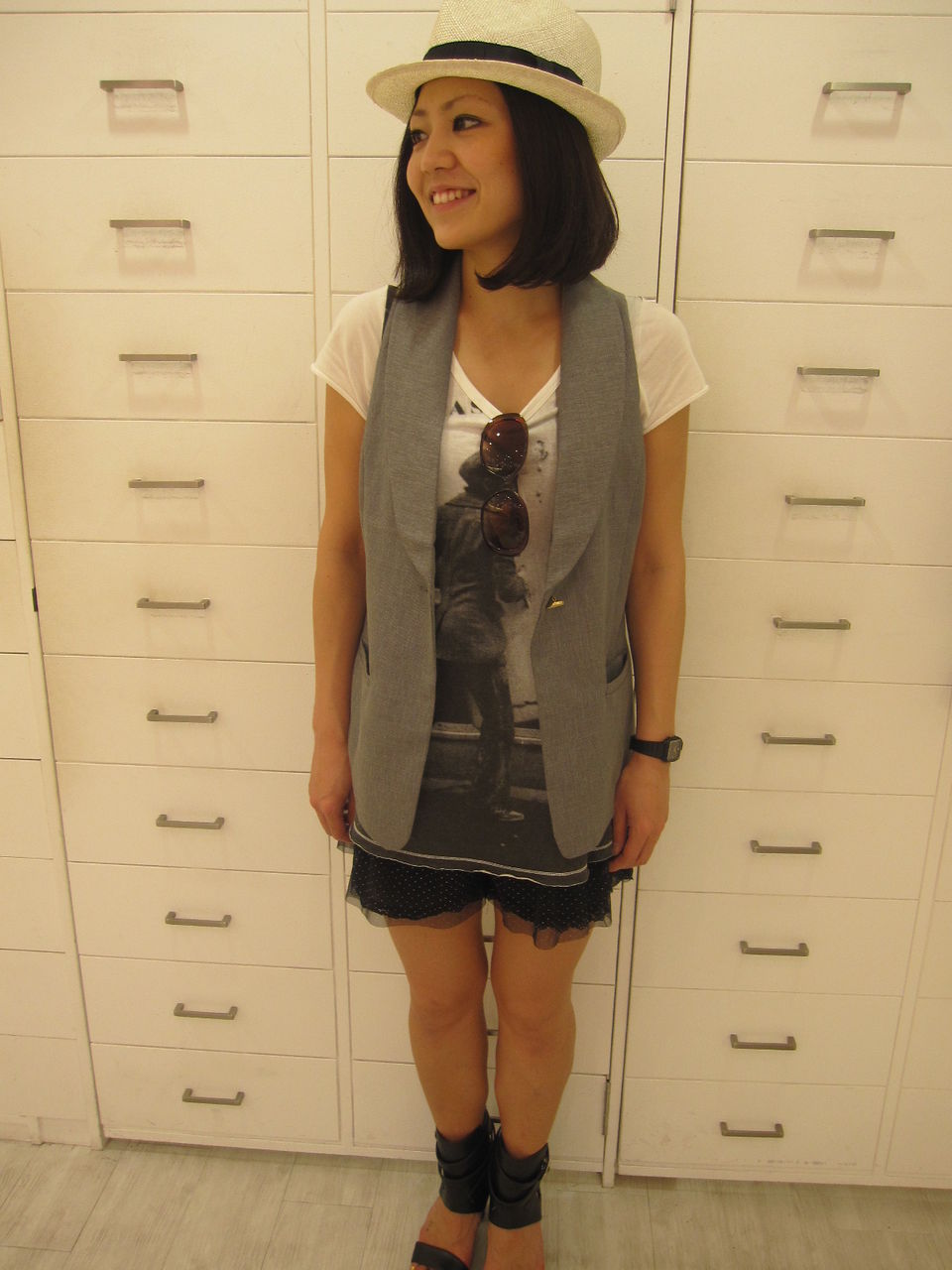 HATとグレーのベストでバランスよく重たくならないんです♪