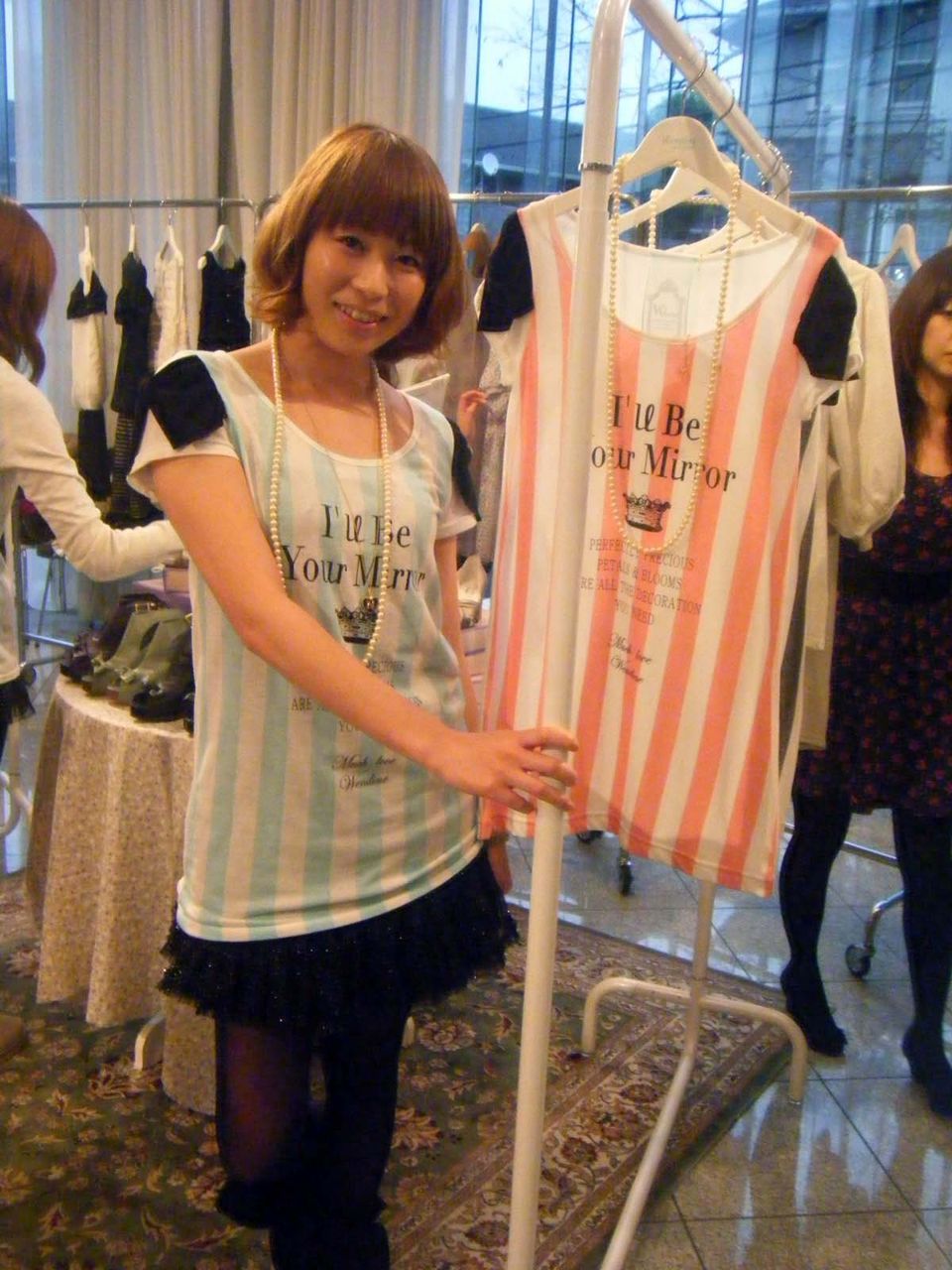 続いてデザイナーの寺島が着用していますのがパールのネックレスがセットになったストライプTシャツOP
