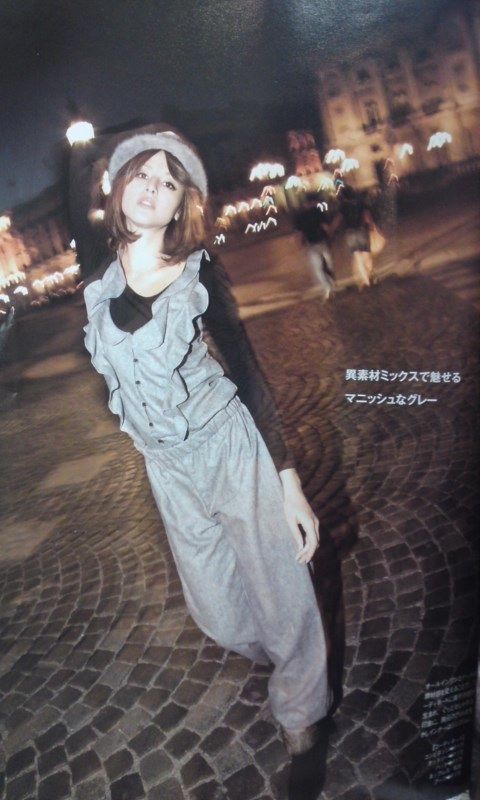 足元はロングブーツと編みタイツでコケティッシュに演出。