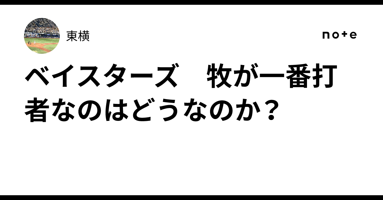 横浜DeNAベイスターズ 牧が一番打者横浜DeNAベイスターズ相川監督は牧を一番打者にしたいと話しています。 確率論からすればありです。出塁率が高い打者を一番にすることは大事です。 ベイスターズ 牧が一番打者なのはどうなのか?|東横お断り 今回の記事の中には一部の方に不快な印象を与える記述がございますことを予めお断り申し上げます。あくまで1ファンの私見ですので科学的根拠や歴史的史実に裏付けられた記述でないことをお詫びいたします。 70年前の野球に拘るか?勝つ野球か? 打順に関しては一番打者が出塁して、二番打者が送って、スコアリングポジションでクリーンアップで点を取るという考え方が…note.com