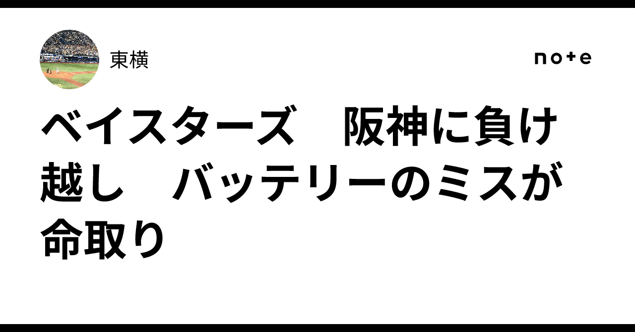 横浜DeNAベイスターズ 阪神タイガースに負け越し横浜DeNAベイスターズは阪神タイガースに敗戦でこのカード負け越しました。 初回、2回とバッテリーエラーが絡む4失点は痛かったです。 ベイスターズ 阪神に負け越し バッテリーのミスが命取り|東横お断り 今回の記事の中には一部の方に不快な印象を与える記述がございますことを予めお断り申し上げます。あくまで1ファンの私見ですので科学的根拠や歴史的史実に裏付けられた記述でないことをお詫びいたします。 竹田祐が浮足立っていた 4月2日横浜DeNAベイスターズは阪神タイガースに3-4で敗戦しました。ベイスターズ先発の竹田祐は初回2回と浮足立っていました。…note.com