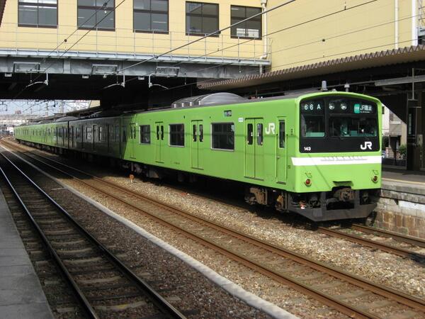 【 #日刊鉄道写真 】柏原駅に停車中の201系JR難波行き普通。この201系は東海道本線で走っていたスカイブルー色のものでしたが、関西線色のウグイス色に塗り替えられました。 pic.twitter.com/nS2r02mFSb