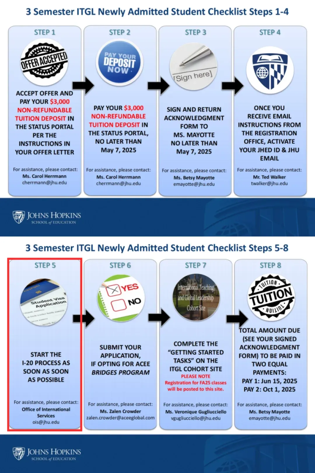 在籍校最終授業日またはSEVISレコードリリース日(早い方)から、JHUの授業開始日まで5ヶ月以内である必要あり。