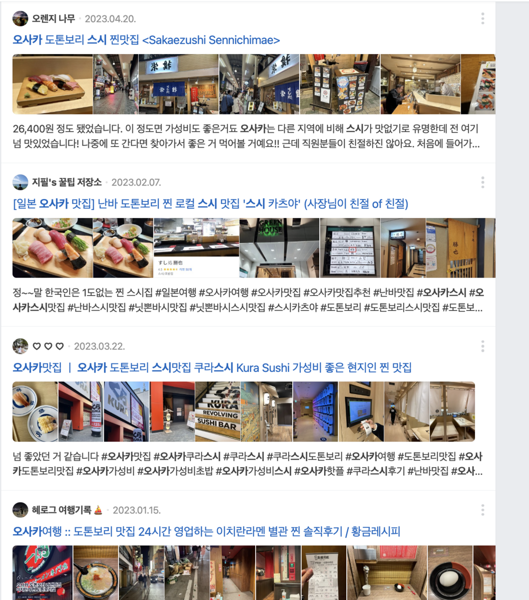 例えば、大阪にあるお寿司屋さんを検索する際にNAVERBLOG画面です。写真や色んな資料がたくさんあります。