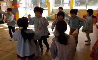 表現あそびでは、動物の特徴をみんなで思い出し、どういう表現があるか考えやっていました。