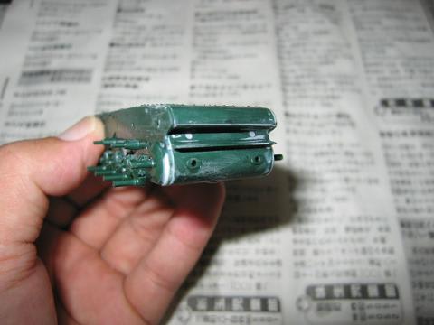 早速、砲塔上部パーツを下部パーツに接着!しようとしましたら、側面装甲がハの字に開いてしまいますので、くっつくまで保持。