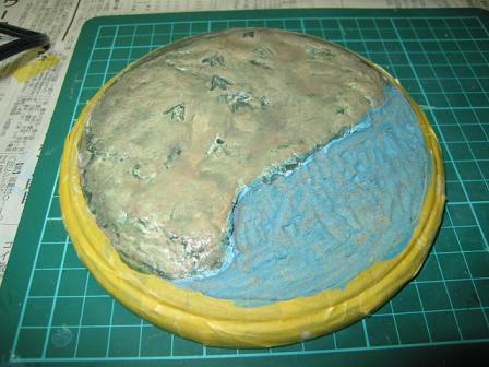 ここはベースを彫刻刀で荒く削って、凹凸をつけております。ここに水を表す素材を盛ります。底の凹凸で水面をイメージさせるという作戦なんですが、上手くいくかどうかはわかりません。