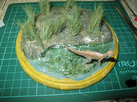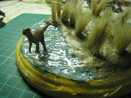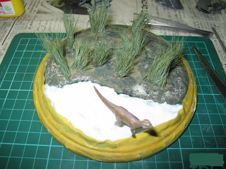 草を塗って余ったところに黒(ツヤ有り:水性)をぶち込み、水性溶剤で薄めて地面に塗ります。いままですこし茶色っぽすぎたので、ちょっと補正。