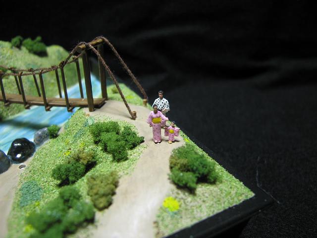 川は、紙を敷いて適当に青やら白で着彩。その上に木工用ボンドを流し、乾いてから水面に緑などで薄く色を乗せてます。