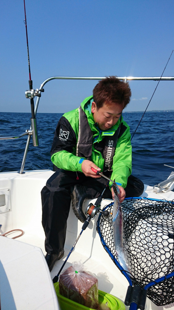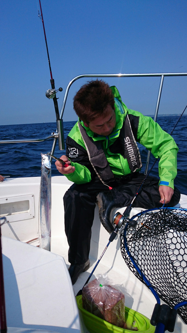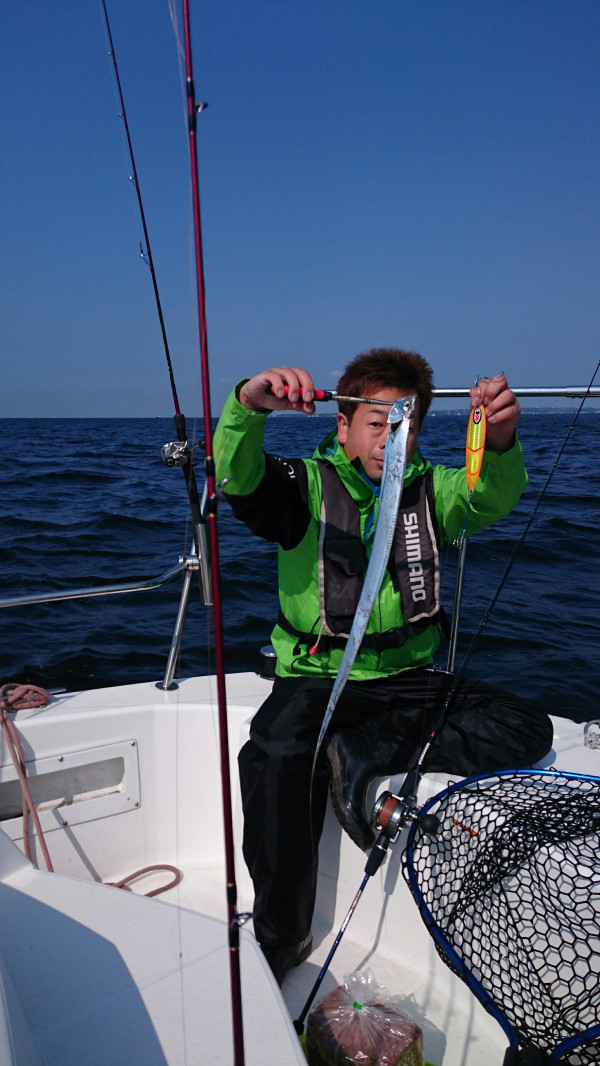 イカ短、ウィリー等で調査しましたが、スロジで一投目にあたりがあり、何か乗ったとまたもや斉藤君、あがって来たのは指3位のタチウオでした。