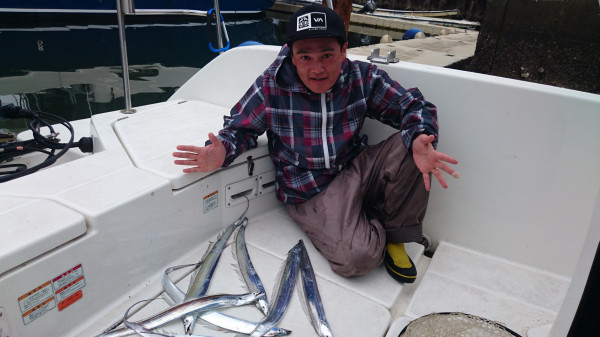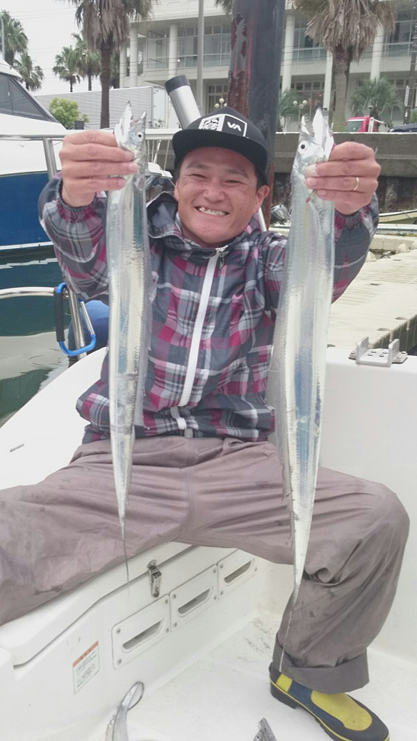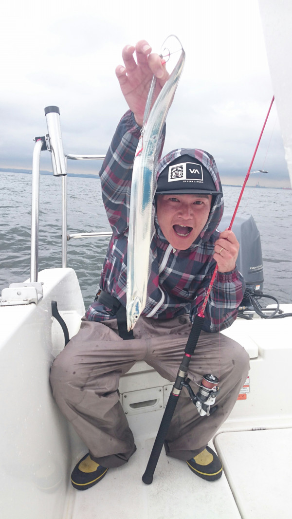 その後一本追加して、流し直したら、直ちゃんにアタリ!指3本でしたが、初めてのタチウオが釣れました。その後5本追加して