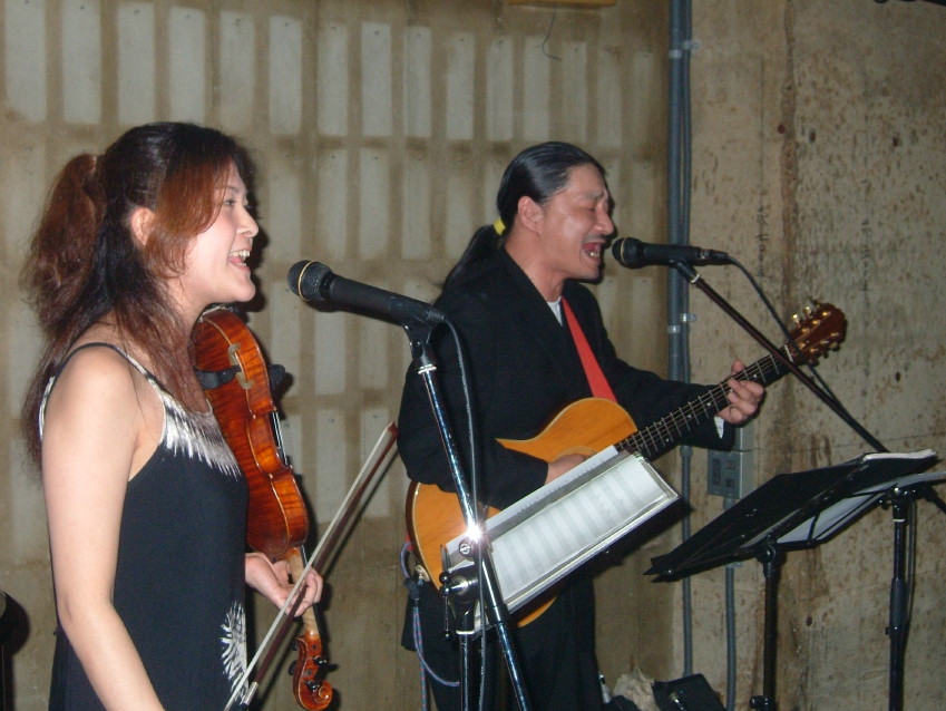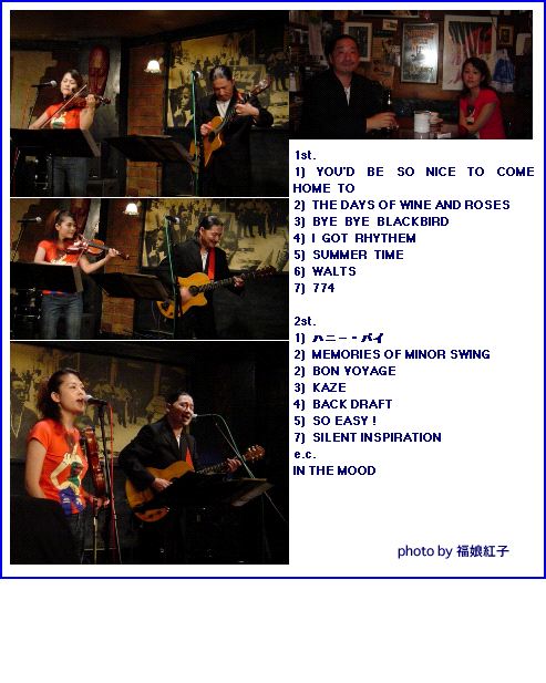 Jamの音楽は、「お洒落」や「オシャレ」という軽い表現では無く、「洒落ている」といういい意味の古さが似合うと思っていますが、エアジンという店はまさに二人にぴったりのステージという感じでした。床も壁も、弦の生の音を柔らかく響かせ、時間の感覚を奪いました。