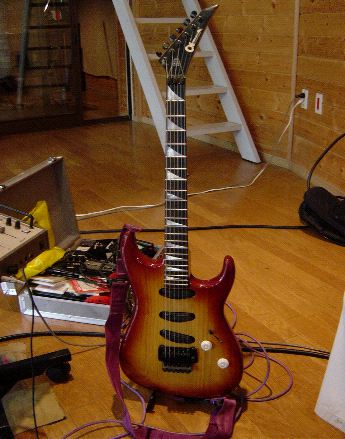 たまたま写真を見つけたので紹介します。ヘビメタブームでは一世風靡したシャーベルというメーカー。いわゆるコンコルドヘッド&フロイトローズ。もうかれこれ10年近くなるか?「ケンギターズ」が高円寺にあった頃、中古を格安でゲット!コントロールノブをオシャレに?白に交換。ライブではほとんど使ったことがありませんが、レコーディングではけっこう使ってきました。どうやらアクティブ回路のようで(電池を発見して気がついた)特有のコンプレッション具合がレコーディングには、あつかい安く、ライブでは物足りないという感じです。これまた、インテリアにもグ~な逸品です(^ o ^)/