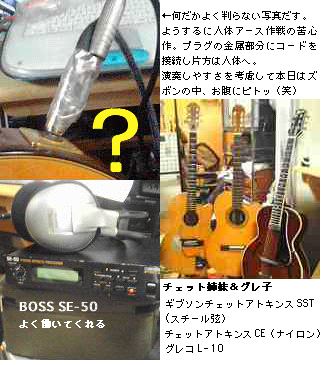 チェットCEがアースノイズ発生。ブ~~~~とかなりな低音。ライブだとやり過ごす程度なのだが、レコーディングとなるとかなり気になるので、あまったコードを使って自分の身体でアースをとる。....もう、身体じゅうがコードまみれ!(;^_^A