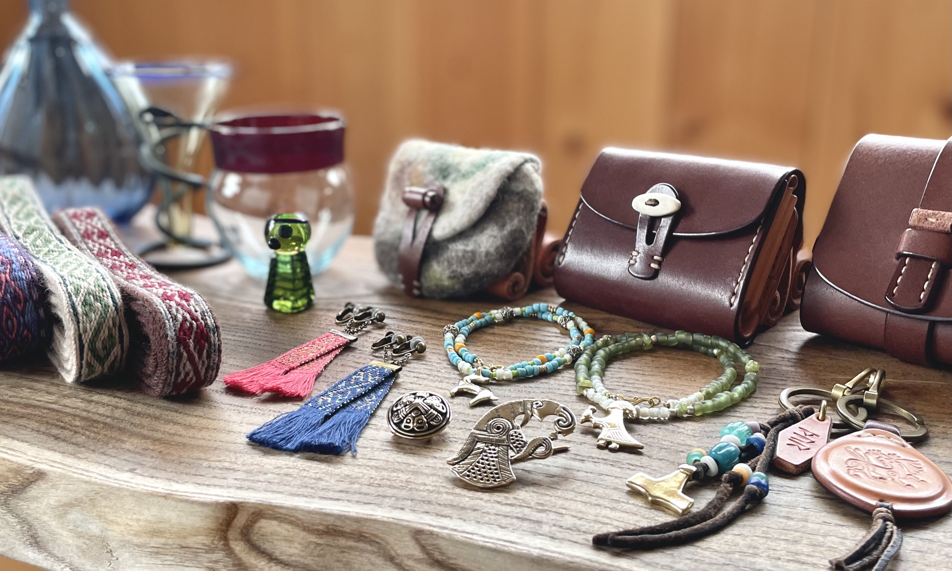 私たちの作る革製品とアクセサリーを中心に、協力してくれている仲間たちの作品、ヨーロッパからの輸入雑貨、ヴァイキングをテーマにいろいろなジャンルの商品を取り揃えています。