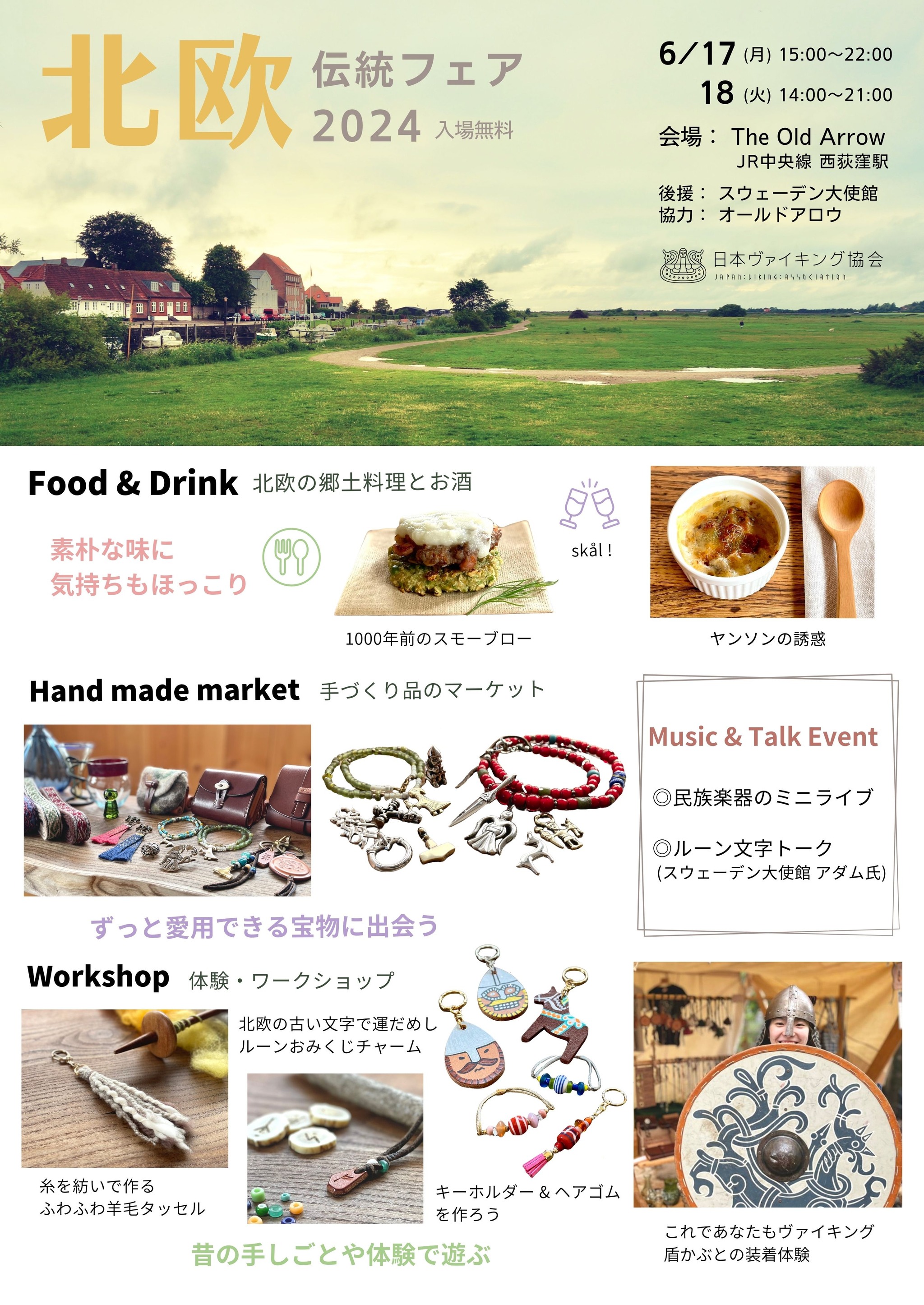 会場は西荻窪のブリティッシュパブ、The Old Arrow オールドアロウ。北欧の料理やお酒の提供もご協力いただきます。また今回のイベントは、スウェーデン大使館にご後援いただきました。皆さまに支えられて開催できること、大変嬉しく思っています。