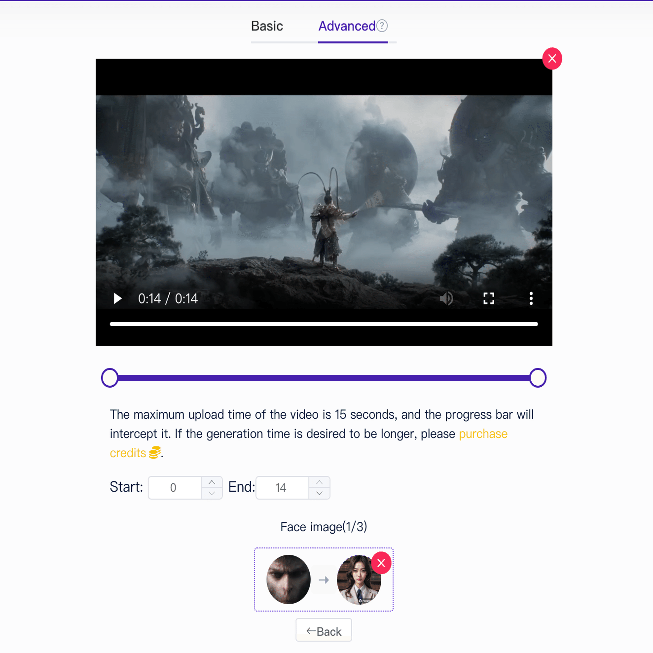 ステップ2: AIFaceswapでビデオの顔交換機能を開きます。無料と有料の両方のオプションを提供しています。あなたのニーズに基づいて適切なものを選択してください。5秒未満のビデオの場合は、無料のオプションで十分です。ただし、顔交換ビデオが5秒を超える場合は、有料オプションでクレジットを購入することを選択できます。