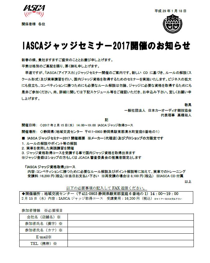 早速ですが、「IASCA(アイアスカ)」ジャッジセミナー開催のご案内です。