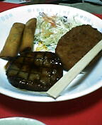 業務用スーパーの春巻きと、業務用スーパーのハンバーグと、業務用スーパーのコロッケと、サラダ。