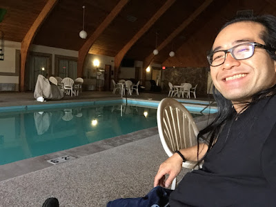 ウチら、いつもは昼間に運転して次のコンサートに向かって、夜には演奏するっていうパターンなんですけど、昨日はマチネで昼間のショーだったこともあり、昨日のうちに移動してしまったので、今日は半日休みッスわ~。は~、あっしはプールサイドでマッタリ~。ウチの若い衆たちはまだ寝ておりまふ。