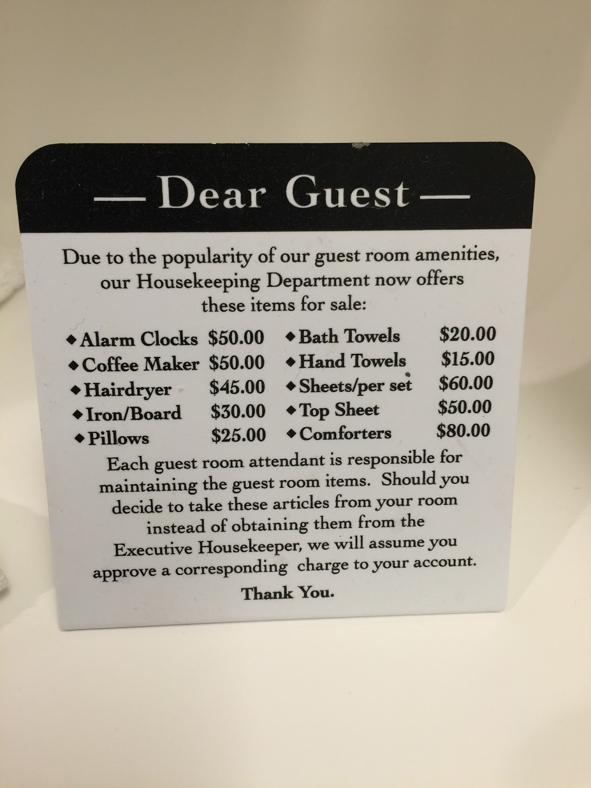 めっさオモロいホテルのサイン私、数々のホテルに泊まってきましたが、これが今まで見た中で一番オモロかったものです。もしもこれを盗んだらいくら、と全部の品物と値段がリストされてます。このリストを見た時、バンド全員が大爆笑してまいました。
