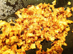 フライパンに油をひき、ニンニク(分量の3/4)に色が付き香りがするまで炒める。