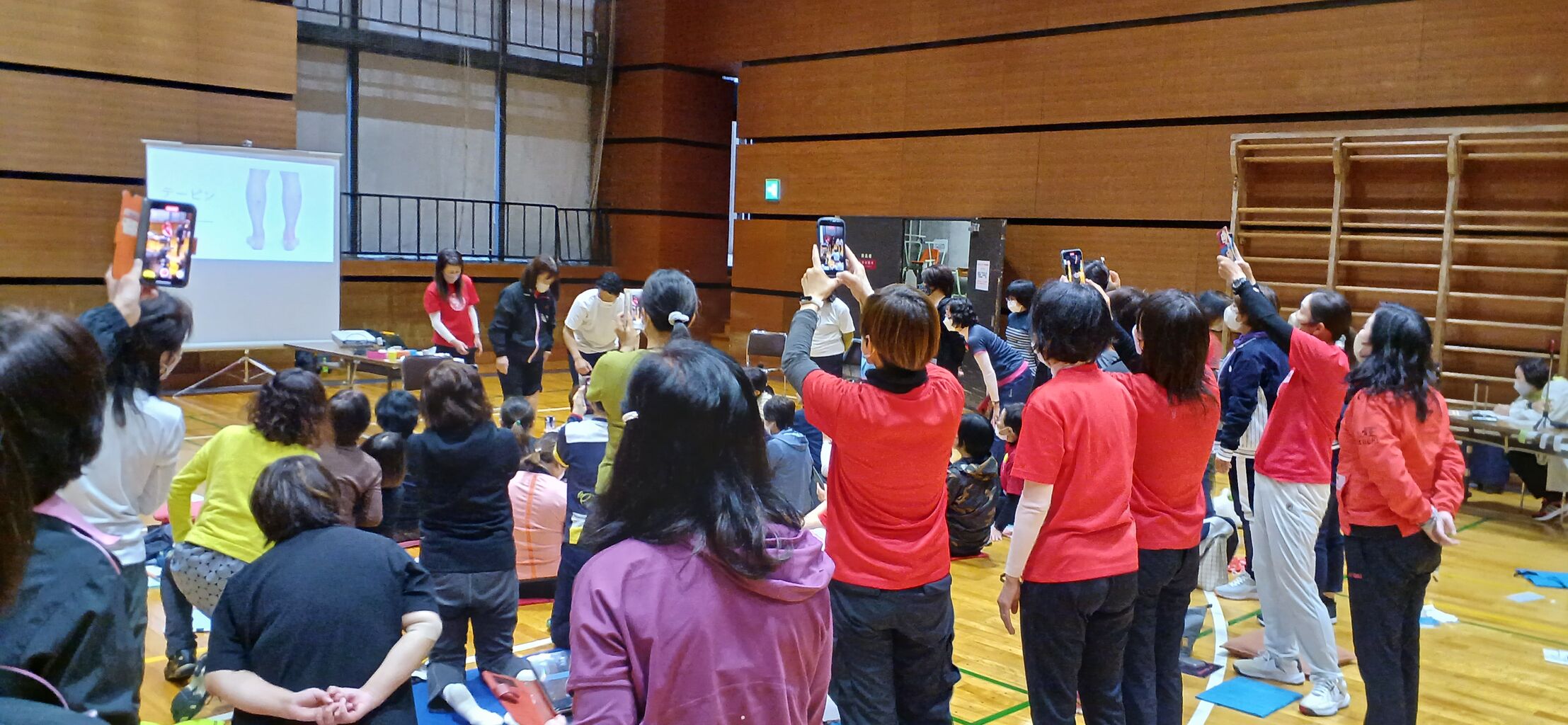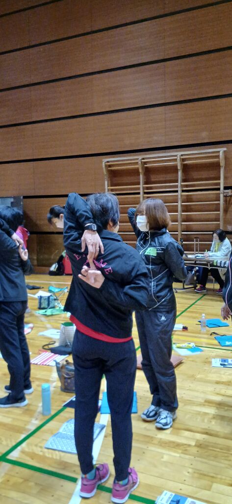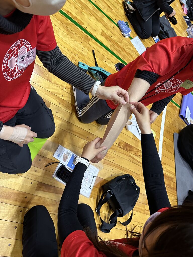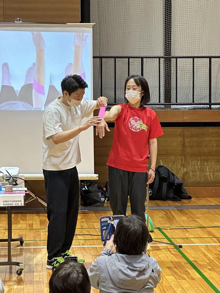 肘と膝のテーピングの方法をみんなで確認しながら行いました。