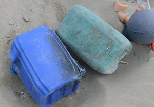 そんなゴミ溜めみたいな海岸線の中でも目立つのが、20リットルほどの容量がある青いポリタンク。残っているラベルを読み取ると、