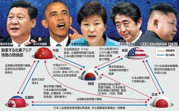 韓国人「激変する北東アジア情勢…韓国の進むべき道は?」韓国と中国が会談を行えば、北韓は中国を千年の敵と非難する。日本は、北韓への送金や人の往来など、対北韓制裁のほとんど全てを解除した。そんな中、日本と米国は集団的自衛権行使をめぐって、同盟関係が強化されている(笑)米国は、中国と韓国をあまり良くは見ていないだろう。韓国は流れにうまく乗らなくてはならない。翻訳元:http://www.ilbe.com/3832892867