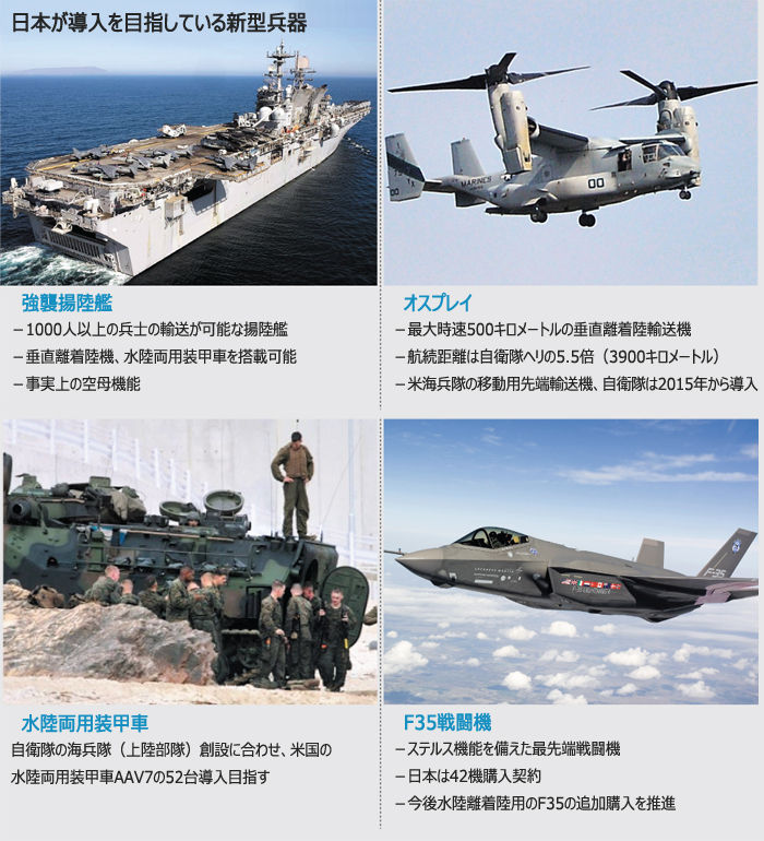 日本は米海兵隊の水陸両用装甲車、垂直離着陸輸送機「オスプレイ」の導入も決めた。