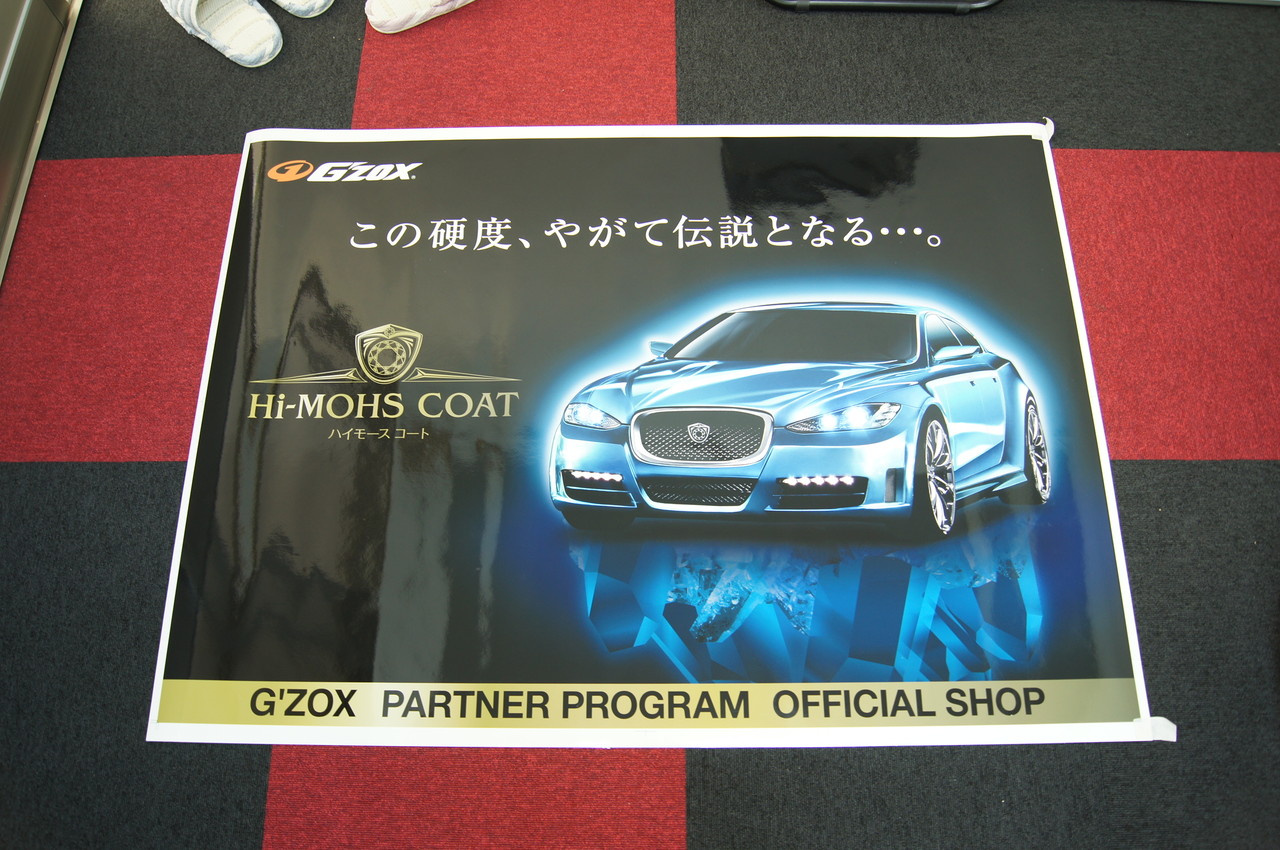 移転のお祝いに頂いちゃいました♪いつもお世話になっているコーティング剤のメーカーであります、【ソフト99コーポレーション】様より、新店舗の看板にとロゴ入りの看板用ステッカーシートを頂戴いたしました【G'ZOXリアルガラスコート】と【ハイモースコート】のロゴマーク最下部にはメーカー施工認定店としての【OFFICIAL SHOP】の文字近日中に、お店の社屋の側面に看板としてデビューする予定です。ソフト99コーポレーション様、この度はありがとうございましたm(_ _)m