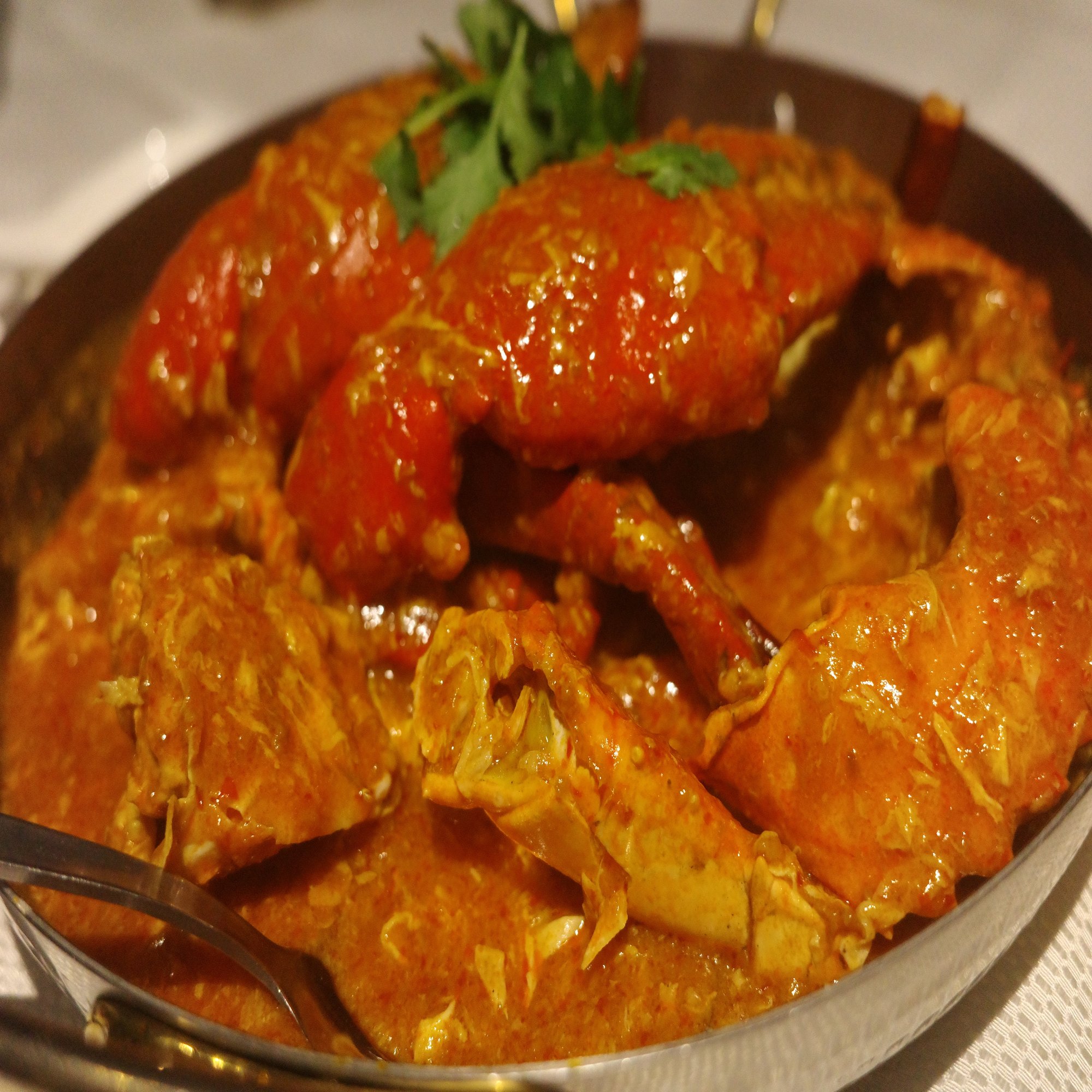 運ばれてきたのは、真っ赤なソースに溺れた巨大なチリクラブ。