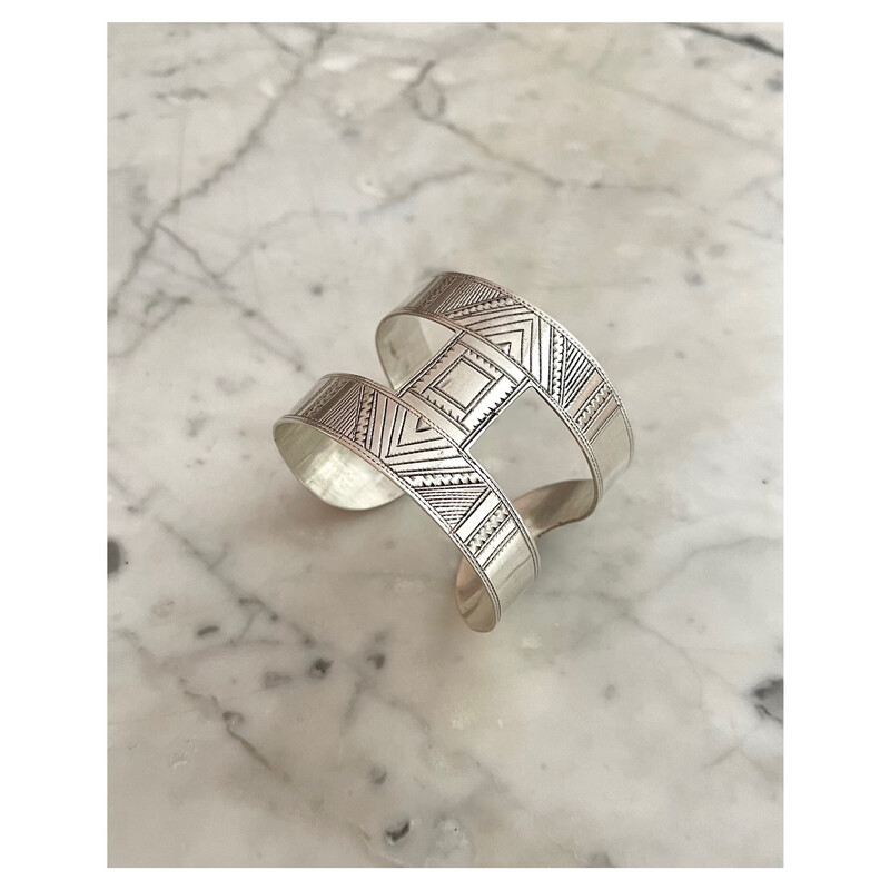 シンプルなスタイルに大ぶりのTouareg Silver ペンダントやブレスレットが合います。