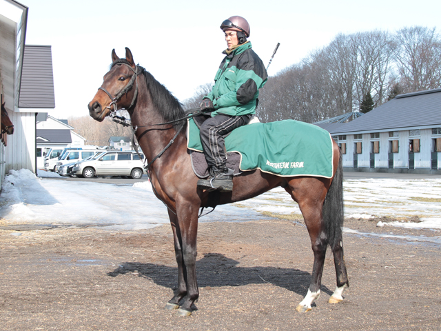 3/5 2月21日から騎乗調教を開始し、1週間ほど角馬場でダクとハッキングを行い、今週から坂路でハロン24秒程度の軽めキャンターを開始した。特に悪さをするようなところはないが、まだ気の向くままに動いている時もあり、もう一度騎乗者との約束事を再確認しながらじっくり乗り込み、基礎体力を強化していく。現在の馬体重は440kg。