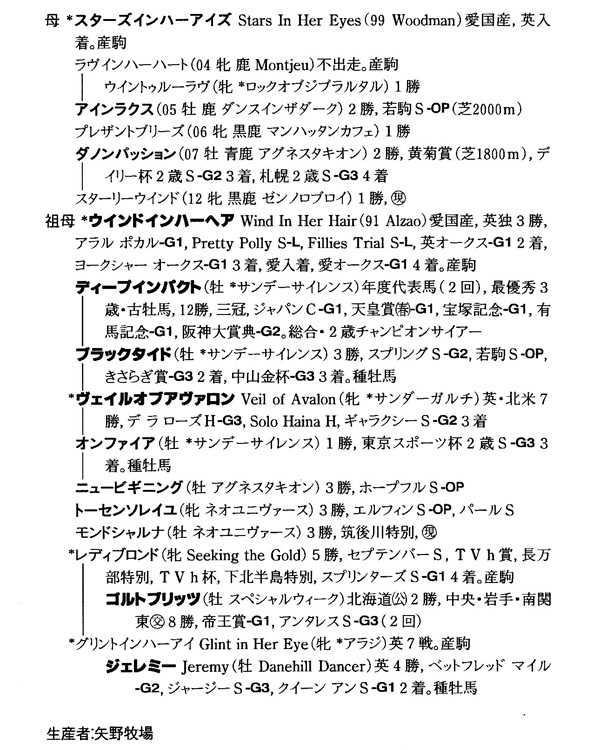 そして母スターズインハーアイズ(彼女の両眼に輝る星) なのでその母系の流れから・・・彼女の怪しい唇とか彼女の高く美しい鼻とか・・・で馬名を考えてクラブに提出しましたが、出来が悪くて却下でした。