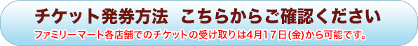 | チケットの受け取り方法 | ●会員先行 一次販売 4月17日(金)よりチケット受取番号(引換番号)が開示されます。ログイン後、お客様自身でご確認いただき、ファミリーマート各店舗でチケットをお受け取りください。 ●二次販売 4月20日(月)よりチケット受取番号(引換番号)が開示されます。ログイン後、お客様自身でご確認いただき、ファミリーマート各店舗でチケットをお受け取りください。 ●一般販売 4月20日(月)よりチケット受取番号(引換番号)をメールでご案内いたします。メール受信後、ファミリーマート各店舗にてチケットの受取が可能です。 会員チケットはファミリーマート各店舗の「Famiポート」からの発券のみとなり、ご自宅への発送等のサービスはございません。予めご了承ください。