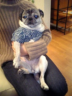 パーティ@名倉家でした~。相変わらず、広すぎる家に大人11人と子供達とパグちゃん。みんな前回のから学習しました。気持ちよかそうにみえてもマッサージチェアは禁止。前回、飲み過ぎ、食べ過ぎ、歌い過ぎの上マッサージチェアに横になった全員が順番にトイレに篭る羽目に。帰る際、大洋さんが横になってましたが、その後は知らず。。美味しいご飯と、楽しいおしゃべりでハッピーなパーティでした写真は淵辺家のパグちゃん。風呂敷柄に背中には登り龍のイラストのお洋服、サイコーに可愛いかった☆
