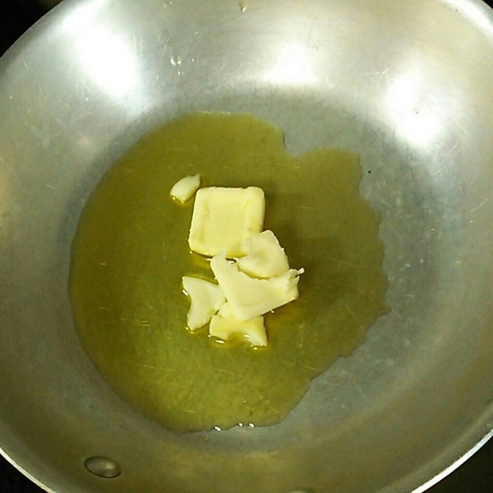 火をつけていないフライパンに、オリーブ油➕バターを入れます