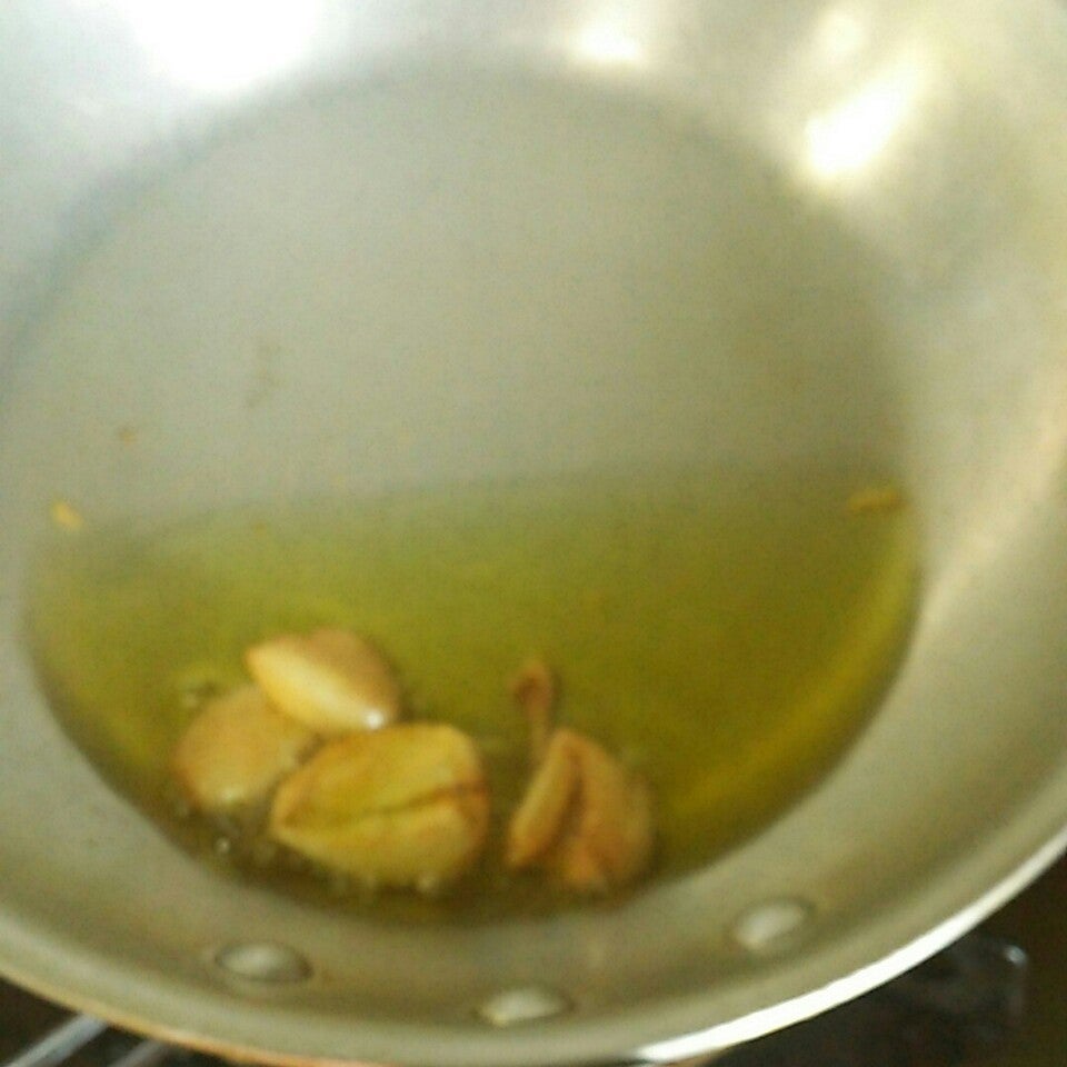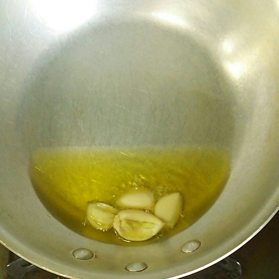 まず、フライパンにオリーブ油、ニンニクを常温で入れます