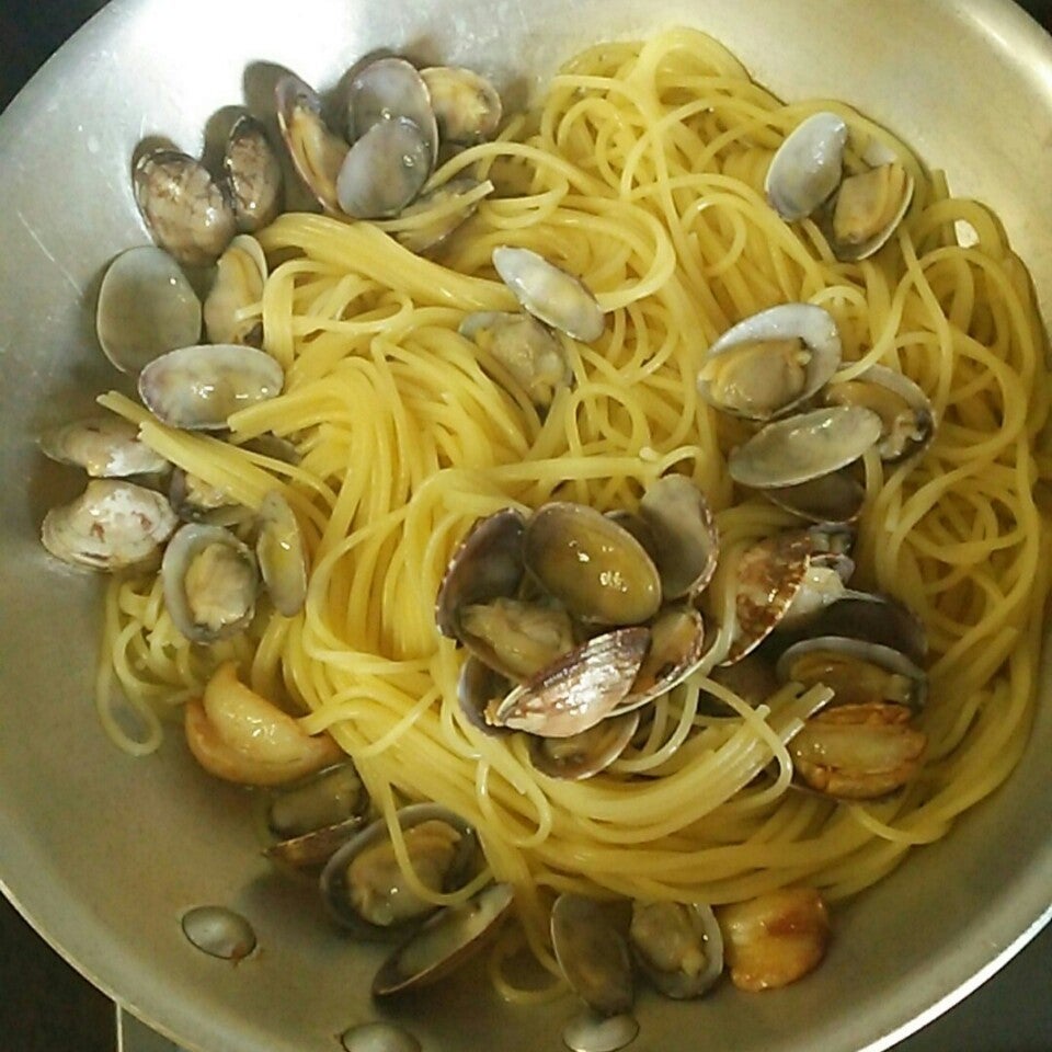 3辺りからパスタを茹で始め、ニンニクとアサリを入れてパスタと和えます