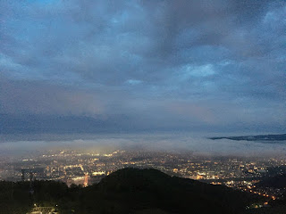 說到這個,Yu不得不提,當天一心要看夜景,完全忘了自己有懼高症,進到纜車上才驚覺不妙,但是已經進退兩難,只好緊抓欄杆撐過那五分鐘,和Yu有一樣困擾的人......如果有勇氣撐過到中腹五分鐘的纜車,那到展望台的那段就可以不用怕了,這段比較穩。不過前段的纜車和貓空的比起來,個人覺得已經算不那麼晃了...撐過後就可以欣賞美景啦~這次天氣沒那麼好,所以還有雲遮著