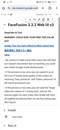 指定のColabリンクを開き、「Install」を実行。 フェイスフュージョン