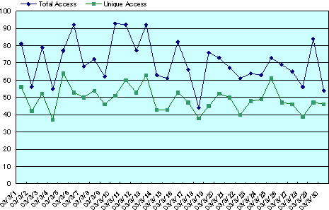 3/1~3/30までのアクセスログによる トップページのアクセス数:2117 ユニークアクセス数:1475