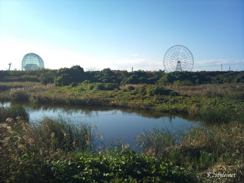橋の上から見た西なぎさの全景。湾岸エリアのビル群が遠くに見えます。