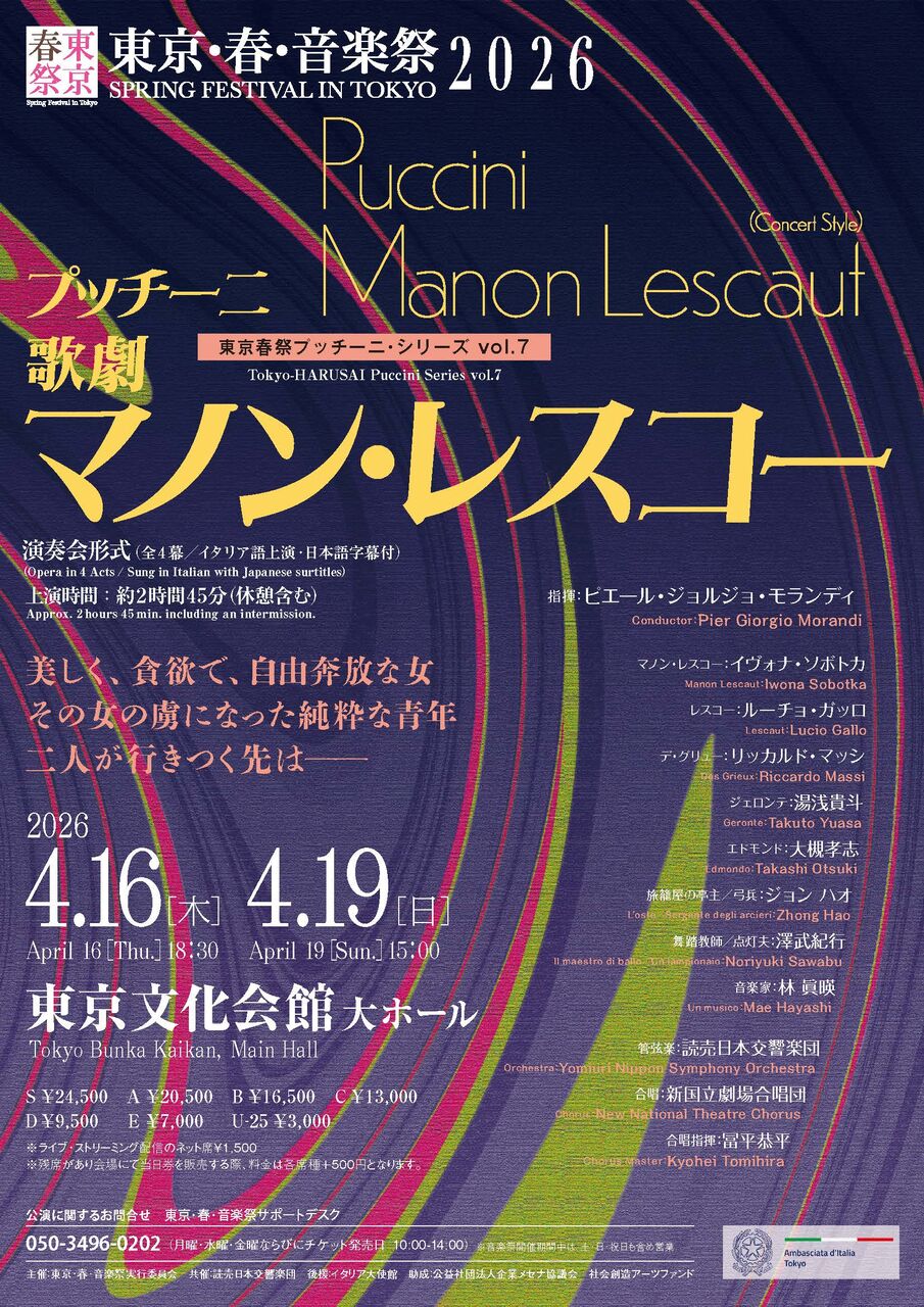プッチーニ「マノン・レスコー」 全4幕/イタリア語上演・日本語字幕付き 演奏会形式